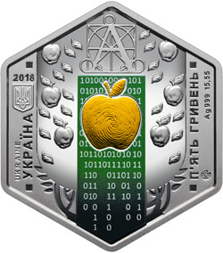| Описание аверса: | На аверсе монеты `Эра технологий` размещено: слева: год чеканки монеты 2018, малый Государственный Герб Украины и надписи UKRAINE / УКРАИНА (вертикально) справа - номинал монеты ПЯТЬ ГРИВЕН, обозначение металла, массы монеты в чистоте - Ag 999 15,55 (вертикально) и логотип Банкнотно-монетного двора Национального банка Украины (внизу); вверху на зеркальном фоне стилизованного изображения дерева жизни с плодами-яблоками - графическое построение начальной буквы алфавита `А` как символ познания, письма, грамотности, под которой стилизованная композиция, символизирующая развитие высоких технологий: на зеленом фоне, заполненном цифрами двоичного кода (использовано тампопечать), изображено яблоко (локальная позолота) с отпечатком пальца человека. |