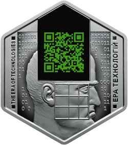 | Описание реверса: | На реверсе монеты размещено: на зеркальном фоне, заполненном цифрами двоичного кода, барельефное изображение головы человека со схемой пропорций лица, определенной Леонардо да Винчи, вверху - на черном фоне цветной QR-код (использовано тампопечать) - двумерный матричный штрих-код как символ достижений буквенно-цифрового кодирования, используемый во всем мире; вертикальные надписи: THE ERA OF TECHNOLOGIES (слева) и ЭРА ТЕХНОЛОГИЙ (справа). |