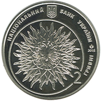| Описание аверса: | На аверсе монеты вверху размещен малый Государственный Герб Украины и надпись полукругом НАЦИОНАЛЬНЫЙ БАНК УКРАИНЫ, справа - логотип Монетного двора Национального банка Украины, год чеканки монеты 2015, номинал 2 гривны, в кругу - стилизованную работу Я. Гниздовского `Соняшник` (1974 ). |