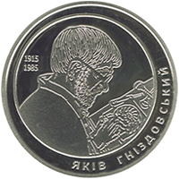 | Описание реверса: | На реверсе монеты размещено: в кругу работу Якова Гниздовского `Автопортрет` (1981.) слева годы его жизни 1915/1985, внизу надпись полукругом Яков Гниздовский (справа). |