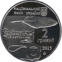 | Описание аверса: | На аверсе монеты размещены: вверху надпись НАЦИОНАЛЬНЫЙ / БАНК УКРАИНЫ, справа от которого - малый Государственный Герб Украины; стилизованная композиция, символизирующая передачи земли - на фоне страницы с автографом Галшки Гулевичивны изображено перо (вверху) и печать (внизу), справа - номинал 2 / ГРИВНЫ, под которым год чеканки монеты 2015 и логотип Монетного двора Национального банка Украины. |