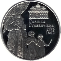 | Описание реверса: | На реверсе монеты изображена стилизованная композиция: вверху - фасад дома, с которого начиналась история Киевской братской школы, под которым надпись Галшка / Гулевичивна и годы его жизни 1575/1642, налево изображен Галшка Гулевичевна с детьми. |