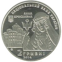 Описание аверса: На аверсе монеты вверху надписи: НАЦИОНАЛЬНЫЙ БАНК УКРАИНЫ (полукругом), АННА / ЯРОСЛАВНА; слева - малый Государственный Герб Украины; в центре - стилизованный образ киевской княжны Анны на фоне Софии Киевской, внизу: номинал - 2 / ГРИВНЫ, год чеканки монеты - 2014 и логотип Монетного двора Национального банка Украины (слева).
