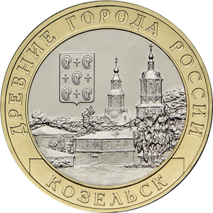 Описание реверса: Вид на Никольскую церковь, вверху слева — герб города Козельска; на кольце по окружности — надписи, вверху: «ДРЕВНИЕ ГОРОДА РОССИИ», внизу: «КОЗЕЛЬСК».