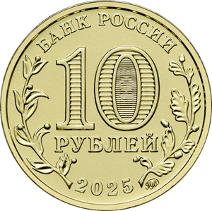| Описание аверса: | Обозначение номинала монеты «10 РУБЛЕЙ», внутри цифры «0» — скрытые, видимые поочередно при изменении угла зрения изображения числа «10» и надписи «РУБ», cлева и справа — стилизованные изображения ветви лавра и дуба соответственно, вдоль канта вверху — надпись «БАНК РОССИИ», внизу — год выпуска «2025», справа от него — товарный знак монетного двора. |