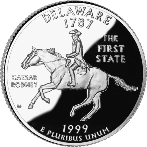 | Описание реверса: | Портрет Цезаря Родни на лошади. Сверху надпись — DELAWARE, под ней год присоединения 1787, снизу — год чеканки 1999 и надпись «E Pluribus Unum», по бокам надписи — "The First State", "Caesar Rodney". |