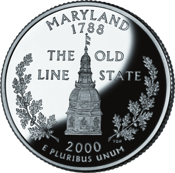 | Описание реверса: | Купол здания парламента Мэриленда, ветки белого дуба. Надпись: «The Old Line State» (Штат старой границы). Сверху надпись — MARYLAND, под ней год присоединения 1788, снизу — год чеканки 2000 и надпись «E Pluribus Unum». |