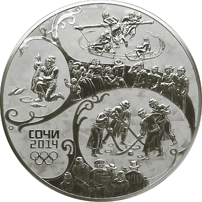 | Описание реверса: | На матовом диске монеты, в центре справа - фигуры четырех мужчин с клюшками в руках, играющих в старинную русскую народную игру "Котёл", вверху у канта - карусель в виде Т-образного ворота с привязанными к нему двумя санками с детьми, приводимая во вращательное движение тремя мужчинами, между игроками и каруселью - группа мужчин, женщин и детей, наблюдающих за ними, в центре слева - фигура мужчины, сидящего у лунки на льду и держащего в руках крупную рыбу, внизу у канта - группа людей в зимних одеждах, среди них - продавец газет, слева у канта - надпись "СОЧИ 2014", под ней - пять Олимпийских колец. |