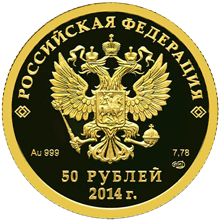 | Описание аверса: | На лицевой стороне монеты расположено рельефное изображение Государственного герба Российской Федерации, над ним надпись полукругом "РОССИЙСКАЯ ФЕДЕРАЦИЯ", имеются надписи: номинал монеты – "50 РУБЛЕЙ" и год чеканки – "2014 г.", обозначение металла по Периодической системе элементов Д.И. Менделеева, проба сплава, товарный знак Санкт-Петербургского монетного двора и масса драгоценного металла в чистоте. |