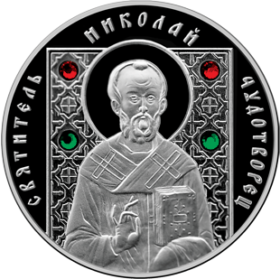 | Описание реверса: | Вверху по кругу – надпись: СВЯТИТЕЛЬ НИКОЛАЙ ЧУДОТВОРЕЦ; в центре – на фоне орнамента, применяемого в иконографии, со вставкой (четыре синтетических кристалла) – образ святого Святителя Николая Чудотворца. |