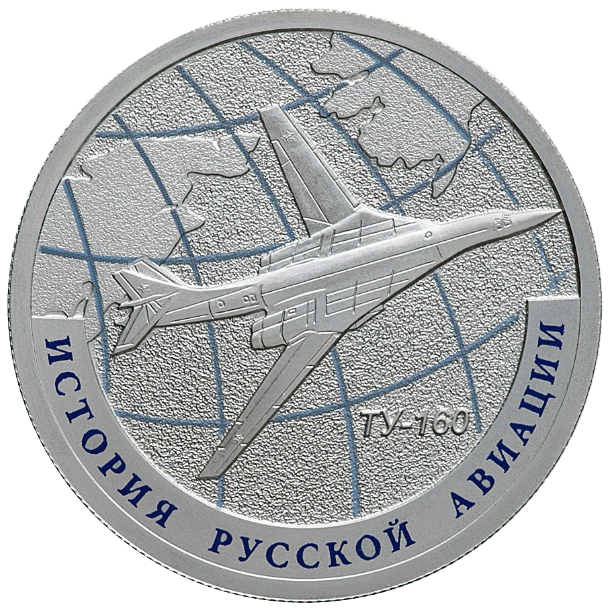 | Описание реверса: | В центре диска на сером матовом фоне земного шара - современный реактивный самолет с крылом стреловидной формы, под ним справа - надпись "ТУ-160", внизу на полосе вдоль канта - надпись синего цвета: "ИСТОРИЯ РУССКОЙ АВИАЦИИ". Ту-160 — российский, ранее — советский сверхзвуковой стратегический бомбардировщик-ракетоносец с изменяющейся стреловидностью крыла был создан в 1970-х годах. На начальном этапе к работе над проектом приступили конструкторские бюро О.П. Сухого и В.М. Мясищева, которые подготовили два различных по схеме проекта четырехдвигательного самолета с крылом изменяемой стреловидности. В последующем в качестве основы проекта был взят сверхзвуковой самолет Ту-144. |
