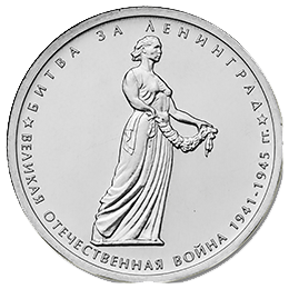 | Описание реверса: | В центре расположено рельефное изображение скульптуры «Мать-Родина» на Пискаревском мемориальном кладбище в г. Санкт-Петербурге, по окружности имеются надписи: «БИТВА ЗА ЛЕНИНГРАД» и «ВЕЛИКАЯ ОТЕЧЕСТВЕННАЯ ВОЙНА 1941-1945 ГГ.», разделенные двумя звездочками. |
