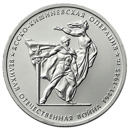 | Описание реверса: | В центре расположено рельефное изображение памятника воинам-освободителям Кишинева от немецко-фашистских войск в г. Кишиневе, по окружности имеются надписи: «ЯССКО-КИШИНЕВСКАЯ ОПЕРАЦИЯ» и «ВЕЛИКАЯ ОТЕЧЕСТВЕННАЯ ВОЙНА 1941-1945 ГГ.», разделенные двумя звездочками. |