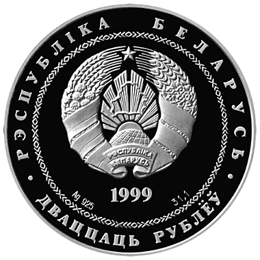 | Описание аверса: | В круге, обрамленном геометрическим орнаментом, – рельефное изображение Государственного герба Республики Беларусь, под ним указаны год чеканки, для серебряной – масса драгметалла в чистоте и проба сплава; по кругу – надписи: в верхней части – "РЭСПУБЛIКА БЕЛАРУСЬ", в нижней – "ДВАЦЦАЦЬ РУБЛЁЎ. |