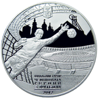 | Описание реверса: | На реверсі монети на стилізованому тлі стадіону `Донбас-Арена` зображено динамічну фігуру воротаря з м`ячем, над якою - панорама міста, угорі - герб Донецька, унизу розміщено напис ФІНАЛЬНИЙ ТУРНІР/ЧЕМПІОНАТУ/ЄВРОПИ/ З ФУТБОЛУ/2012. |