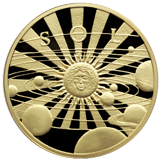 Описание реверса: В центре на фоне стилизованного изображения фрагмента солнечной системы – исполненное золотом стилизованное изображение звезды Солнце; вверху – надпись на латинском языке: SOL.