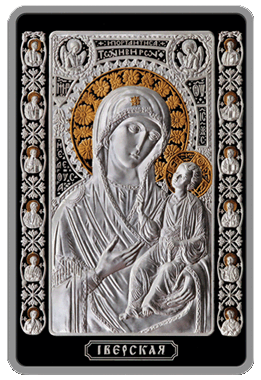 | Описание реверса: | в центре – образ Пресвятой Богородицы "Іверская"; над ним – изображения ангелов и надписи на греческом языке; на фоне стилизованного изображения виноградной лозы с ветвями изображены по обеим сторонам апостолы и евангелисты: Петр, Иоанн, Марк, Андрей, Иаков, Фома, Павел, Матфей, Лука, Симон, Варфоломей, Филипп; изображения нимбов над Спасителем, Богородицей, апостолами и евангелистами, а также звезда на одежде Богородицы исполнены золотом; внизу надпись: ІВЕРСКАЯ. |