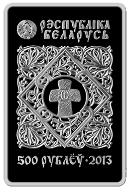 | Описание аверса: | В центре – орнамент в виде виноградной лозы, символизирующей Богородицу, внутри которого -- памятный крест, установленный на замчище в г. Заславле в связи с празднованием 1000-летия православной церкви на Беларуси, и проба сплава; вверху – рельефное изображение Государственного герба Республики Беларусь и надпись в две строки: РЭСПУБЛІКА БЕЛАРУСЬ; внизу – номинал 500 РУБЛЁЎ, справа от номинала – год чеканки 2013. |