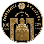 Описание аверса: Вверху – рельефное изображение Государственного герба Республики Беларусь и по кругу надпись: РЭСПУБЛІКА БЕЛАРУСЬ; в центре по кругу надпись: ПРАВОСЛАВНЫЕ СВЯТЫЕ; под ней на фоне орнамента – изображение макета-реконструкции Спасо-Преображенского храма в Полоцке; слева – номинал: 100 РУБЛЁЎ; справа – год чеканки, проба сплава и фирменный (товарный) знак Монетного двора Польши.