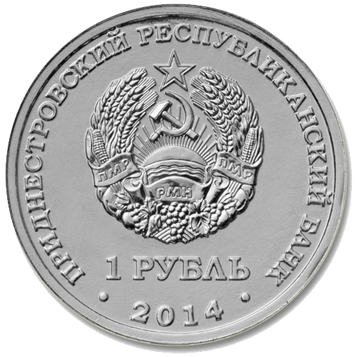| Описание аверса: | В центре – изображение государственного герба Приднестровской Молдавской Республики; по кругу – надписи: вверху – «ПРИДНЕСТРОВСКИЙ РЕСПУБЛИКАНСКИЙ БАНК», внизу – год выпуска монеты «2014»; в нижней части под гербом – номинал «1 РУБЛЬ». |