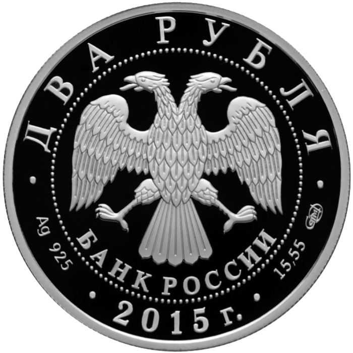 | Описание аверса: | В центре – эмблема Банка России (двуглавый орёл с опущенными крыльями, под ним – надпись полукругом "БАНК РОССИИ"), обрамленная кругом из точек и надписями, вверху – номинал: "ДВА РУБЛЯ", внизу: слева – обозначения драгоценного металла и пробы сплава, в центре – дата выпуска "2015 г.", справа – содержание химически чистого металла и товарный знак монетного двора. |