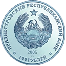 | Описание аверса: | В центре изображение государственного герба Приднестровской Молдавской Республики, по кругу надписи: вверху - "ПРИДНЕСТРОВСКИЙ РЕСПУБЛИКАНСКИЙ БАНК"; внизу - "100 РУБЛЕЙ". В нижней части год выпуска - "2005". |
