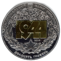 | Описание аверса: | На аверсе монеты вверху размещен малый Государственный Герб Украины и надпись полукругом НАЦІОНАЛЬНИЙ БАНК УКРАЇНИ; в центре - композиция, символизирующая победу: цифры 1944, над которыми - изображение салюта, внизу - лавровая ветвь с лентой и звездой, справа над звездой - год чеканки монеты 2014; внизу надпись полукругом - ДВАДЦЯТЬ ГРИВЕНЬ. |