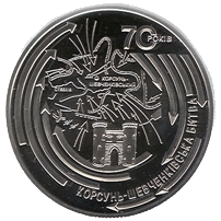 | Описание реверса: | На реверсе монеты размещена стилизованная композиция: в центре на фоне карты изображен въездную ворота дворцового комплекса в г. Корсунь-Шевченковском, по кругу размещены стрелки, символизирующие наступательную операцию советских войск по всему кольцу окружения группировки противника, и размещены надписи: 70 лет (вверху справа), Корсунь-Шевченковской битвы (внизу полукругом). |