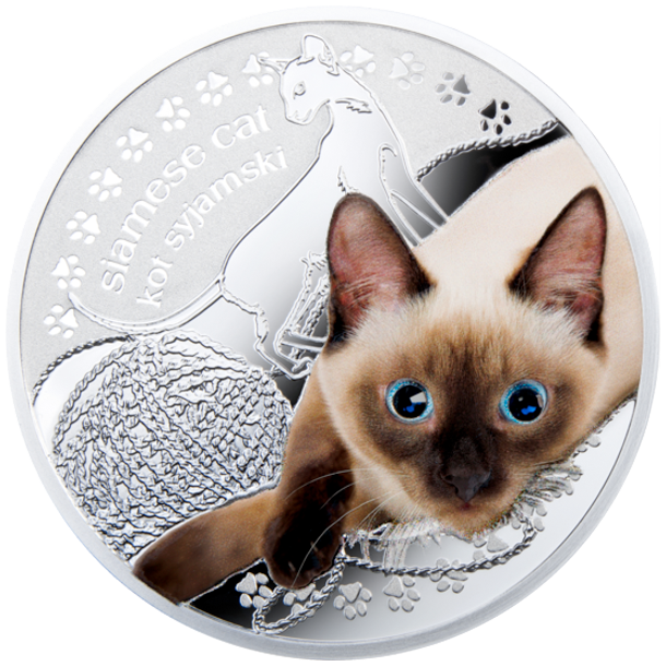 Описание реверса: На первом плане – многоцветное изображение сиамской кошки, глаза которой декорированы кристаллами SWAROVSKI ELEMENTS. На фоне – рельефное изображение сиамской кошки. Выше – полукруглая надпись: SIAMESE CAT / KOT SYJAMSKI (название кошки на английском и польском языках). По кайме – декоративные элементы в виде следов кошачьих лапок.