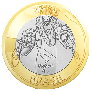 | Описание реверса: | На реверсе монеты изображен спортсмен в трех этапах конкурса (бег, плавание и езда на велосипеде). В центре эмблема Олимпийских игр в Рио 2016 игр и надпись слева сверху «BRAZIL». |