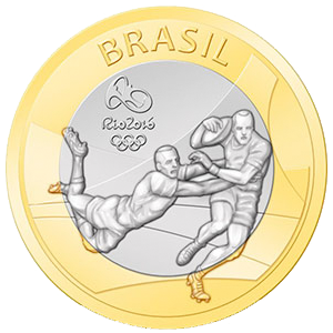 | Описание реверса: | На реверсе монеты два игрока регби соревнуются за мяч. В центре эмблема Олимпийских игр в Рио 2016 игр и надпись слева сверху «BRAZIL». |