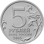 | Описание аверса: | На лицевой стороне монеты в центре расположено обозначение номинала монет в две строки «5 РУБЛЕЙ», ниже — надпись «БАНК РОССИИ», под ней дата «2015», слева и справа — стилизованная ветка растения, в правой части монеты — товарный знак московского монетного двора. |