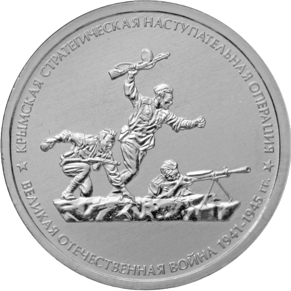 | Описание реверса: | На оборотной стороне монеты в центре расположено рельефное изображение фрагмента диорамы «Штурм Сапун-горы 7 мая 1944 года», по окружности имеются надписи: «КРЫМСКАЯ СТРАТЕГИЧЕСКАЯ НАСТУПАТЕЛЬНАЯ ОПЕРАЦИЯ» и «ВЕЛИКАЯ ОТЕЧЕСТВЕННАЯ ВОЙНА 1941-1945 ГГ.», разделенные двумя звездочками. |