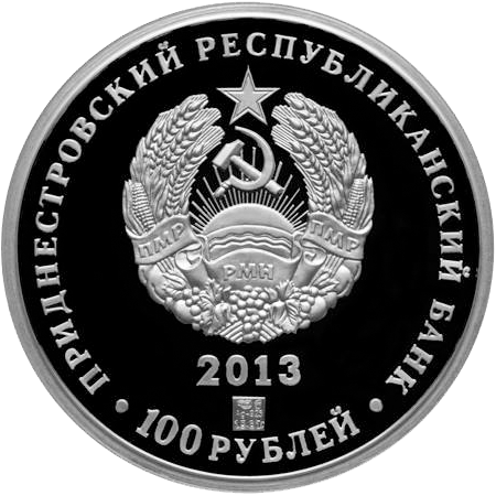 | Описание аверса: | В центре – изображение государственного герба Приднестровской Молдавской Республики; по кругу – надписи: вверху – «ПРИДНЕСТРОВСКИЙ РЕСПУБЛИКАНСКИЙ БАНК», внизу – «100 РУБЛЕЙ»; в нижней части под гербом – год выпуска монеты «2013», ниже – логотип изготовителя, государственное пробирное клеймо, обозначение металла, проба сплава, масса. |
