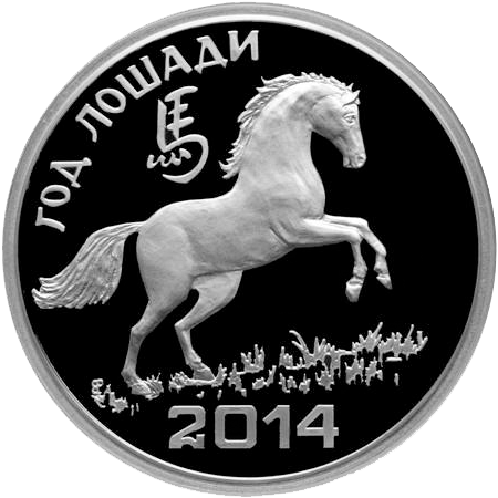 | Описание реверса: | В центре – крупным планом стилизованное изображение лошади; слева – надпись «ГОД ЛОШАДИ», иероглиф, обозначающий символ 2014 года, внизу – надпись «2014». |